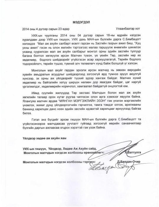 УИХ-ын чуулганы 2014 оны 04 дүгээр сарын 18-ны өдрийн нэгдсэн хуралдаан дээр УИХ-ын гишүүн, УИХ дахь МАН-ын бүлгийн дарга С.Бямбацогт хэлэхдээ “Мал аж ахуйн салбарт өсөлт гарсан нь Засгийн газрын ажил биш, Хуц ухны ажил” гэсэн нь олон жилийн тэртээгээс малаа гаршуулж өнөөгийн шинжлэх ухаанд суурилсан мал аж ахуйн салбарыг монгол орны эдийн засгийн тулгуур багана болтол хөгжүүлж ирсэн Малчин түмэн, үе үеийн Төр, засгийн нөр их хөдөлмөрүг хэлсэн.