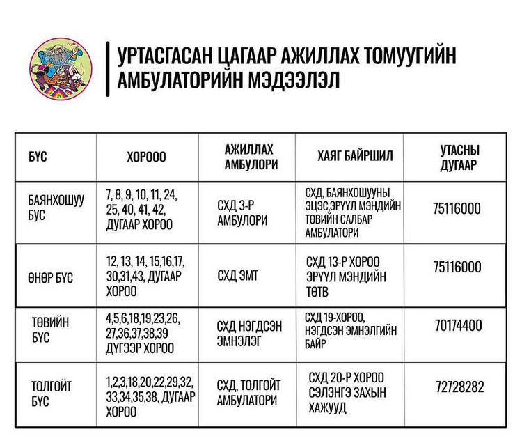 Уртасгасан цагаар томуугийн амбулатори ажиллаж байна