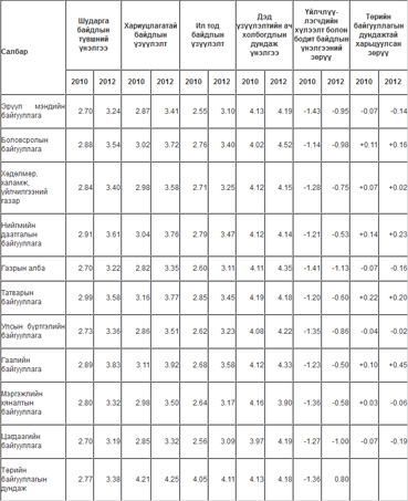 “Монгол Улсын төрийн байгууллагын шударга байдлын түвшин-2012” судалгаанд эрүүл мэнд, боловсрол, хөдөлмөр, халамж, нийгмийн даатгал, газар, татвар, улсын бүртгэл, гааль, мэргэжлийн хяналт, цагдаа зэрэг 10 салбар байгууллага хамрагдсан байна. Төрийн үйлчилгээний дээрх салбаруудын шударга байдлын түвшний үнэлгээ 2012 оны байдлаар дунджаар 3.38 пункт байгаа нь хоёр жилийн өмнөхөөс 0.61 пунктээр өссөн үзүүлэлттэй гарчээ. Энэ нь сүүлийн хоёр жилд төрийн байгууллагын шударга байдлын түвшин дээшилснийг илэрхийлж буй үзүүлэлт аж. Гэвч салбар бүрийн хувьд харилцан адилгүй байгаа нь төрийн байгууллагуудад шударга байдлын түвшингээ нэмэгдүүлэн ажиллах шаардлагатайг Авлигатай тэмцэх газрын судалгааны дүн харуулжээ.