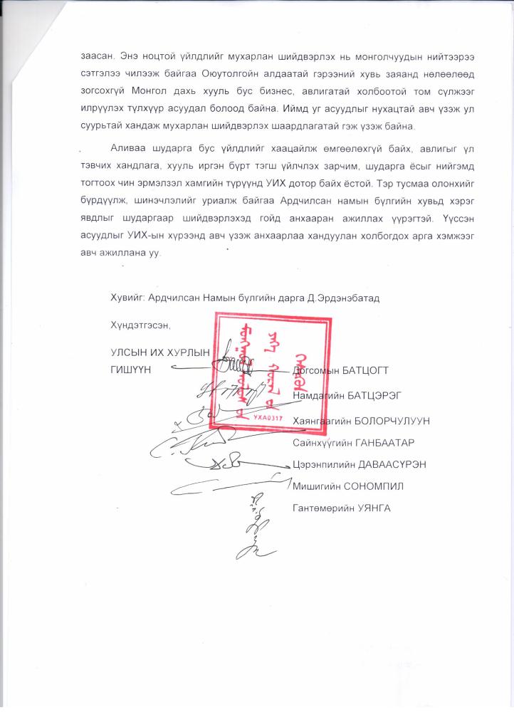 УИХ дахь Шударга ёс эвслийн МҮАН-ын гишүүн Д.Батцогт, Н.Батцэрэг, М.Сономпил, Г.Уянга болон бие даагч гурван гишүүн УИХ-ын дарга З.Энхболдод хандаж байр сууриа илэрхийлжээ.