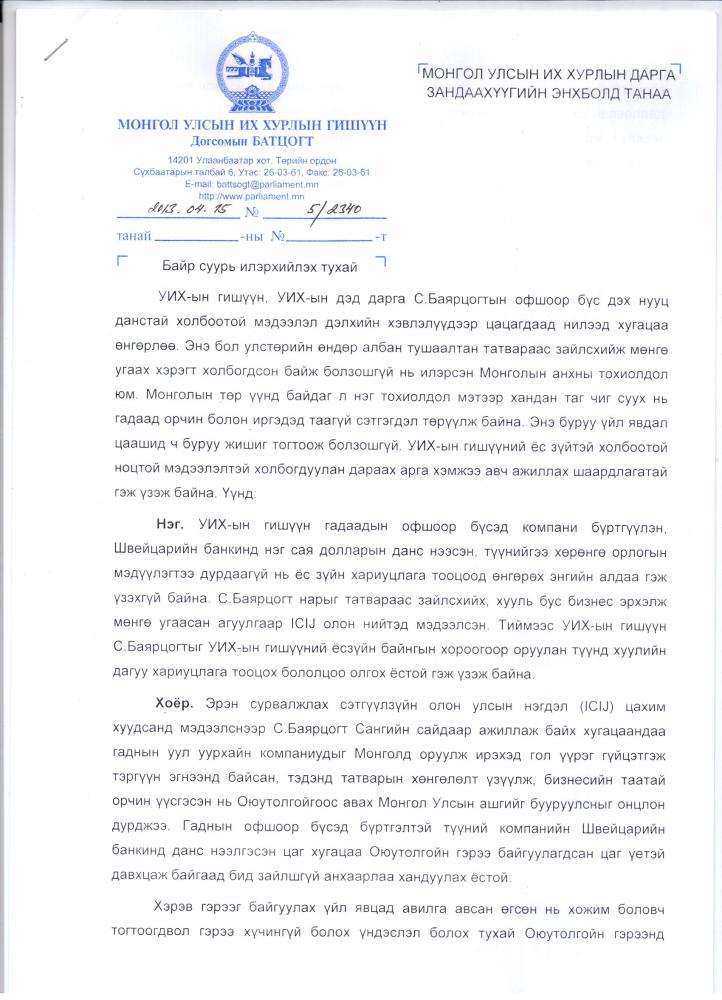 Тэд УИХ-ын гишүүн, УИХ-ын дэд дарга С.Баярцогтын оффшор бүс дэх нууц данстай холбоотой мэдээлэл дэлхийн хэвлэлүүдээр цацагдаад нилээд хугацаа өнгөрлөө . Энэ бол улстөрийн өндөр албан тушаалтан татвараас зайлсхийж мөнгө угаах хэрэгт холбогдсон байж болзошгүй нь илэрсэн Монголын анхны тохиолдол юм. Монголын төр үүнд байдаг л нэг тохиолдол мэтээр хандан таг чиг суух нь гадаад орчин болон иргэдэд таагүй сэтгэгдэл төрүүлж байан. Энэ буруу үйл явдал цаашид ч буруу жишиг тогтоож болзошгүй. Тиймээс арга хэмжээ авах нь зүйтэй хэмээн үзэж байгаагаа илэрхийлжээ. Түүгээр ч барахгүй УИХ-ын Ёс зүйн дэд хороогоор оруулж, хуулийн дагуу арга хэмжээ авахыг тэд шаардсан байна.