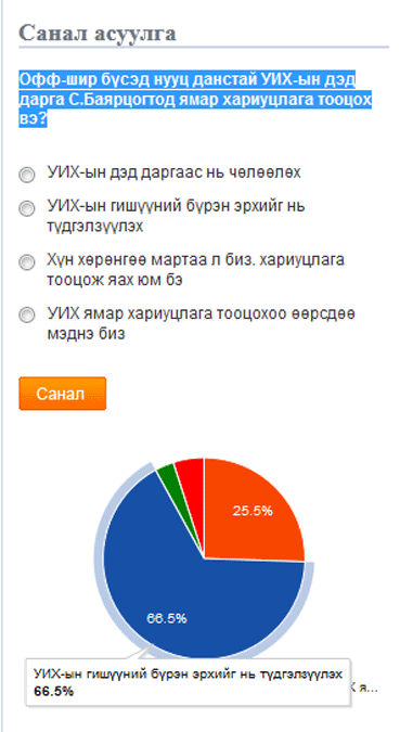 Тэгвэл иргэд С.Баярцогтын тухайд ямар бодолтой байгааг нэгэн судалгаанаас харъя. Манай сайт С.Баярцогтыг хэвлэлийнхэнд хандаж мэдээлэл хийсний дараа энэхүү судалгааг олон нийтийн дунд явуулсан юм. “Офф-шир бүсэд нууц данстай УИХ-ын дэд дарга С.Баярцогтод ямар хариуцлага тооцох вэ?” гэсэн санал асуулга явуулахад судалгаанд оролцогсдын 66.5 хувь нь УИХ-ын гишүүний бүрэн эрхээс нь түдгэлзүүлэх хэрэгтэй гэдэг санал өгсөн байна. Харин УИХ-ын дэд даргаас нь чөлөөлөх гэдэг хариултад судалгаанд оролцогсдын 25.5 хувь нь санал өгсөн бол, ямар хариуцлага тооцох эсэх нь УИХ-ын бүрэн эрхийн асуудал гэж таван хувь нь хариулжээ. Харин С.Баярцогтын өмгөөлж, “Хүн хөрөнгөө мартаа л биз” гэж гурван хувь нь хариулсан байна. Иргэд бол ийм бодолтой байна. Тэгэхээр одоо Ёс зүйн дэд хороо ямар шийдвэр гаргахыг л хүлээх үлдлээ. Нэг хачирхалтай нь Ёс зүйн дэд хороонд сөрөг хүчнээс нэг ч гишүүн байхгүй гэдгийг энд онцлон сануулъя.