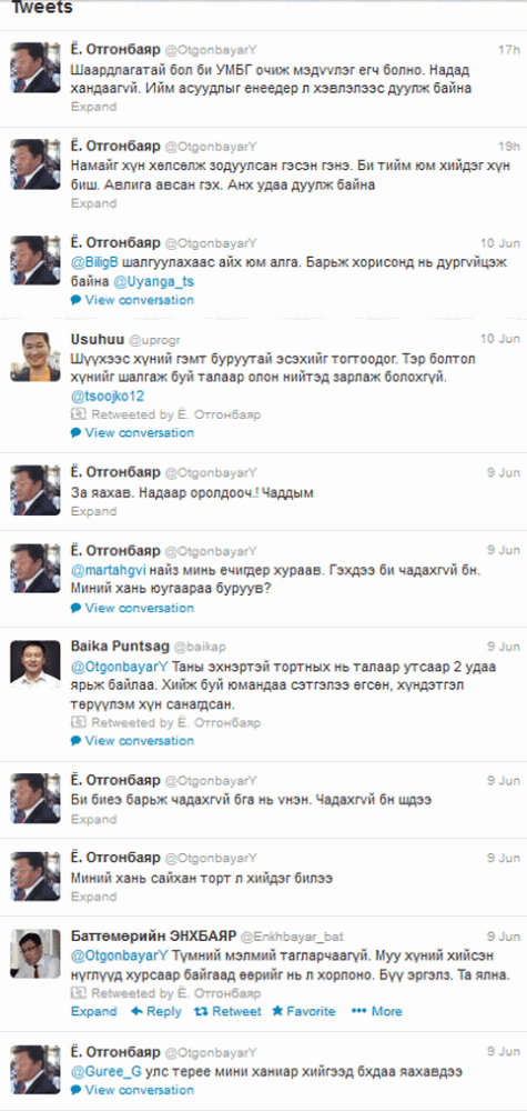 УИХ-ын гишүүн Ё.Отгонбаярт хэцүү байгаа нь ойлгомжтой. Гэтэл мань эр сүүлийн үед жаахан бүлэмцүү байгаа бололтой. Твиттер хуудсаараа дамжуулан өөрийнхөө биеийг барьж чадахгүй байгаа ч илэрхийлжээ.УМБГ-аас өчигдөр мэдээлэл хийж УИХ-ын гишүүн Ё.Отгонбаярыг БСШУ-ны сайд байхдаа иргэн Ч-гээс 230 сая төгрөгийн авилга өгөхийг шаардсан тухай мэдэгдсэн. Эл мөнгөө өгөхгүй болохоор нь дарамталж, залуусаар зодуулсан, машиныг дээрэмдсэн, хоол идэхдээ авилгын мөнгөний хэмжээг тохирсон гээд бүхий л баримт бүрдсэн гэдгийг цагдаагийн байгууллагаас мэдээллэсэн. Харин эрхэм гишүүн үүнийг анх удаа сонслоо мэтээр жиргэж байна. Шаардлагатай бол УМБГ-т очиж мэдүүлэг өгөхөд ч бэлэн боллоо хэмээн мэдэгджээ.