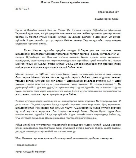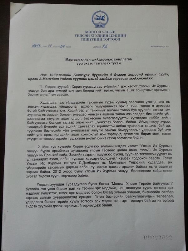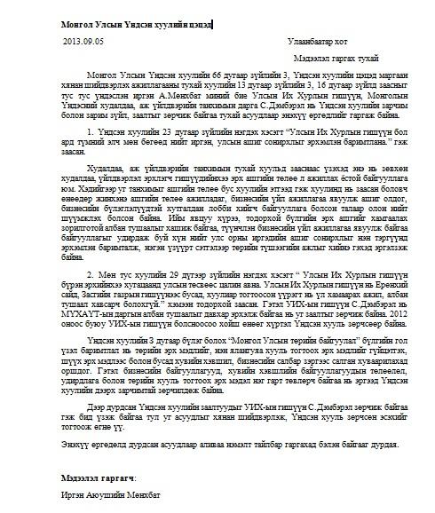 МЗХ-ны Ерөнхийлөгч А.Мөнхбат, УИХ-ын гишүүн, Монголын Үндэсний Худалдаа Аж Үйлдвэрийн танхимын дарга С.Дэмбэрэлийг давхар алба хашиж Үндсэн Хуулийг зөрчсөн гэсэн үндэслэлээр Цэцэд өгч хэвлэл мэдээллийн хэрэгслээр шуугиад авсан. Гэвч Үндсэн Хуулийн Цэцийн гишүүн Ц.Сарантуяа нь маргаан хянан шийдвэрлэхээс татгалзаж тогтоол гаргасан байна. Тэрээр үүнийгээ тайлбарлахдаа “УИХ-ын гишүүн С.Дэмбэрэл нь хуулиар зөвшөөрсөн ажил давхар эрхэлж байгаа тул Үндсэн Хуулийн Цэцэд маргаан үүсгэх үндэслэлгүй байна” гэсэн хариу өгчээ. Харин А.Мөнхбат энэ тогтоолыг эс зөвшөөрч, дахин гомдол гаргаж байгаа юм байна. Тэрээр “...Үндсэн хуулиас бусад хуулийг зөрчсөн эсэх маргааныг цэц харьяалан шийдэхгүй гэж заасан тул УИХ-ын гишүүн С.Дэмбэрэл нь бусад хуулийг зөрчсөн үү, үгүй юу гэдэг асуудлаар Цэцэд хандаагүй. Харин Үндсэн Хуулийн 29-р зүйлийн 1 дэх хэсгийн заалт буюу УИХ-ын гишүүн нь Ерөнхий сайд, Засгийн газрын гишүүнээс бусад, хуулиар тогтоосон үүрэгт нь үл хамаарах ажил албан тушаал хавсарч болохгүй хэмээн тодорхой заасан заалт зөрчигдсөн эсэх талаар Цэц хянан үзэж, шийдвэр гаргаж өгөөч гэж хүссэн. Тиймээс Үндсэн Хуулийн Цэцэд дахин гомдол гаргаж байгааг хүлээн авна уу” гэжээ. Өмнө нь УИХ-ын гишүүн С.Ганбаатар мөн энэхүү шалтгаанаар Үйлдвэрчний Эвлэлийн ерөнхийлөгчийн албанаасаа бууж байсан талаар олныг нуршаад илүүц бизээ. Гэтэл Үндсэн Хуулийн Цэц яагаад С.Дэмбэрэл даргад өөрөөр хандаж иргэний өргөдөл гомдлыг хүлээн авахгүй гэж байгаа нь олны анхаарлыг ихэд татлаа. Ямар сайндаа л Цэц хоёр нүүртэй юу гэж хэлүүлж байхав. Харин дахин гомдол гаргасан энэхүү асуудал хэрхэн шийдэгдэх нь олны өмнө нээлттэй үлдэж байна.