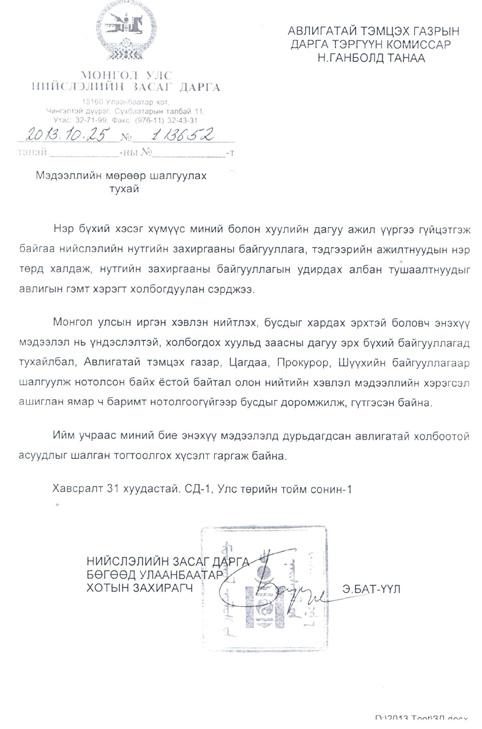 Авилгатай тэмцэх газарт хүргүүллээ. Уг албан бичигт “Нэр бүхий хэсэг