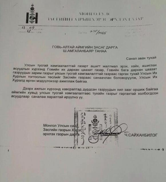 Улсын тусгай хамгаалалттай газарт ашигт малтмал эрэх хайх, ашиглах тухай асуудлын хүрээнд Говийн их дархан цаазат газар, бага дархан цаазат газруудын зарим хэсгийг улсын тусгай хамгаалалтаас гаргах тухай асуудлаар санал авах зорилгоор ЗГХЭГ-ын дарга Ч.Сайханбилэг албан тоот үйлдэн, Говь-Алтай аймгийн Засаг даргад илгээсэн нь олон нийтийн дунд шуугиан тариад байгаа билээ. Уг албан бичигт дурдсанаар, хавсралтад заагдсан зарим газрыг тусгай хамгаалалтаас гаргах тухай УИХ-ын тогтоолын төслийг Засгийн Газраас санаачлан боловсруулж, УИХ-д өргөн барихаар ажиллаж байна гэжээ.