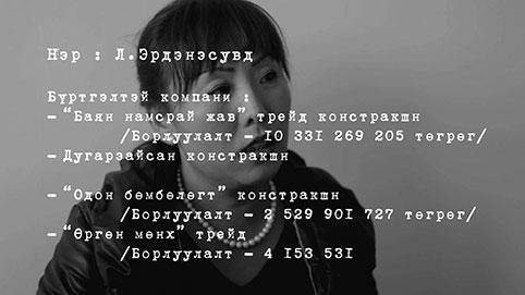 Иргэн Л.Эрдэнэтуяагийн нэрээр “Содбилэгт эрдэнэ”, “Хүчитхас уул”, “Хөөрхөн торомгор” трейд, “Гялалзах үйлсийн өргөө”, “Үлэмж үйлсийн өргөө”, “Жавхлан бат туяа” трейд, “Их өрнөх үлэмж” трейд, “Нахиухуст” трейд, “Хайсын булаг” трейд, “Есүгэн эх” нэртэй аж ахуйн нэгж бүртгэлтэй. Түүний нэр дээрх компаниудын нийт борлуулалт 45.7 тэрбум төгрөгт хүрсэн бөгөөд бүх татварыг Л.Эрдэнэсувд төлөөгүй учраас татвараас зайлсхийгч болж хувирч буй юм. Энэ бол иргэдийн эрхзүйн мэдлэггүй, зарим талаар эмзэг давхаргын, боловсролгүй байдлыг далимдуулан ашиглаж төрийн хөрөнгөөс завшсан хэрэг юм. Одоо дээрх хэргийг цагдаагийн байгууллагад шилжүүлсэн бөгөөд мөрдөн байцаах, шалгах шатандаа яваа аж.