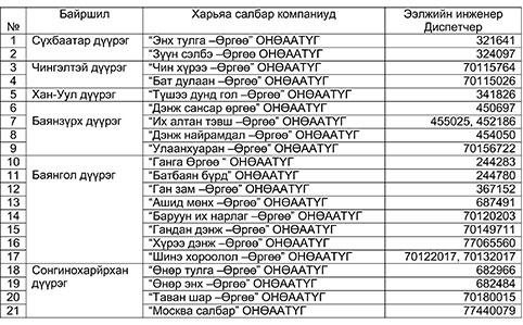 “Орон сууц ашиглалтын” орон нутгийн өмчит газруудтай холбогдох утасны жагсаалт:
