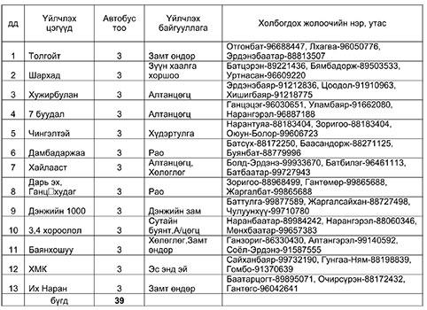 Жич: Нийтийн тээврийн үйлчилгээтэй холбоотой санал, хүсэлтийг доорхи утсуудаар хүлээн авна. Нийслэлийн тээврийн газар: 976 -11 -323176