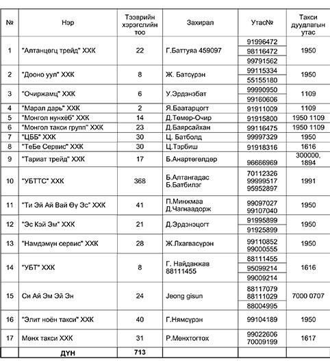 Сар шинийн дуудлагаар үйлчлэх таксийн аж ахуйн нэгжүүдийн жагсаалт: