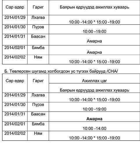 Аж үйлдвэрийн барааны дэлгүүрүүд энэ сарын 30 -нд 10.00 – 21.00 цагт ажиллаж, 31-нээс хоёрдугаар 1, 2 –нд амраад, хоёрдугаар сарын 3 –ноос эхлэн ердийн цагийн хуваарийн дагуу ажиллана.