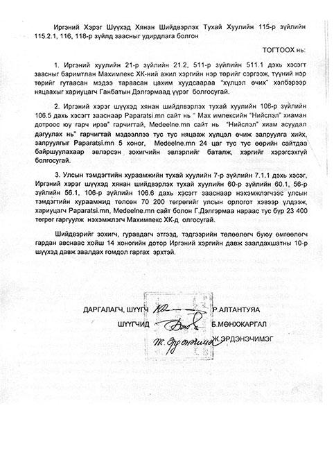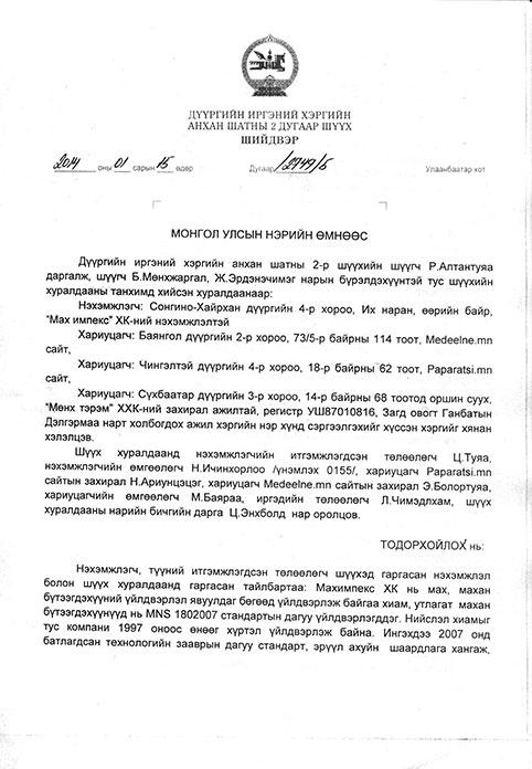 Дээрх буруу ташаа мэдээллээс болж бизнесийн нэр хүнд, ашиг орлогоороо хохирсон “Мах импекс” компани дүүргийн иргэний хэргийн шүүхэд бизнесийн нэр хүндээ сэргээлэх нэхэмжлэх гаргажээ. Гэхдээ компанийн нэр гутаагдсанаас болж учирсан хохирлоо мөнгөөр илэрхийлж хариуцагчдаас нэхэмжлээгүй байна. Гагцхүү буруу ташаа мэдээлэлдээ залруулга хийж, уучлалт гуйхыг хүсэв. Иргэний хэргийн шүүх уг нэхэмжлэлийг шүүн хэлэлцээд иргэн Д нь түгээсэн мэдээллээ нотолж чадаагүй, ташаа мэдээлэл тараасан тул тус компанийн нэр хүндийг сэргээж залруулга хийх, уучлалт гуйх шийдвэр өнгөрсөн сарын 15-нд гаргасан байна. Мөн Д-гийн ташаа мэдээллийг өлгөн авч эх сурвалжийг магадлалгүй, нотолгоогүй мэдээлэл түгээсэн “Paparatsi.mn”, “Medeelne.mn” сайтууд буруугаа хүлээж залруулга гаргахаар болжээ. Ийнхүү цахим ертөнцөөр ашиг хонжоо хайж, бусдын нэр хүнд, бизнест ёс бусаар халдсан хэрэг гарч өнгөрлөө. Тэгэхээр цаашид цахим ертөнцөд түгэж буй мэдээлэл бүрт итгэн бусдад хууртахгүй байх, эх сурвалжийг нягталж, үнэн мөнийг тунгаах нь хамгийн чухал гэдэг нь энэ удаагийн хэрэг явдлаас тод харагдаж байна. Бас иймэрхүү ёс бус буруу ташаа мэдээлэл түгээсэнээс үүдэн дараа, дараагийн хохирогч гарч ирэхийг үгүйсгэх аргагүй юм. Нөгөө талаар нэг хүний түгээсэн худал мэдээлэл нийгэмд ямар их аюул тарьж болохыг ч энэхүү тохиолдол харууллаа.