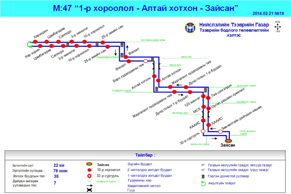 Нийслэлийн тээврийн газраас “1 дүгээр хороолол-Алтай хотхон-Зайсан” чиглэлийн үндсэн М:47 шугамыг 02 дугаар сарын 23-ны өдрөөс эхлэн шинээр нээлээ. Баянгол дүүргийн 1, 3 дугаар хорооны нутагт харьяалагдах Дунд гол, Алтай хотхоны иргэдийн хүсэлтээр нийтийн тээврээр зорчин явах эрэлтийг үндэслэн энэхүү шугамыг нээжээ. Шинэ чиглэлд “Атибус” ХХК 8 автобусаар үйлчилгээ үзүүлж байна.