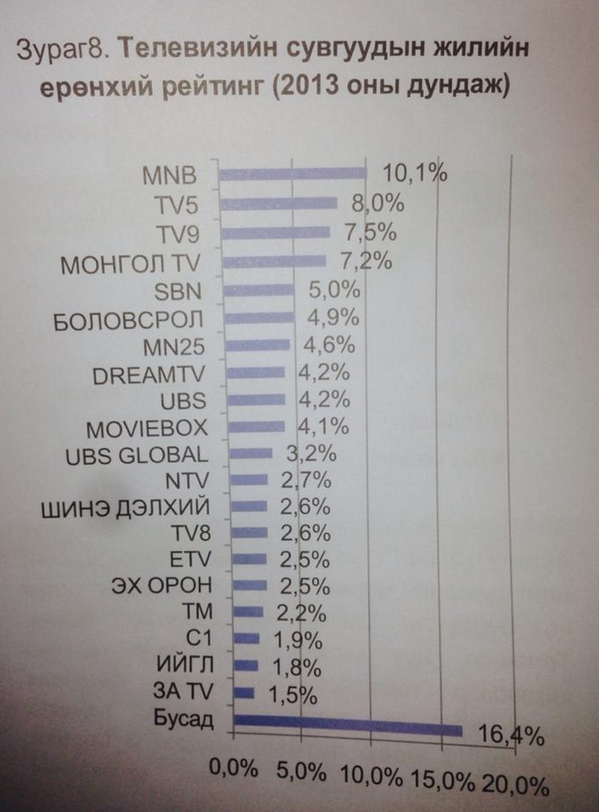 80 сая гаруй хүн амтай Герман улсад л гэхэд “ZDF”, “Deutsche Welle”, “ARD”, “ProSieben”, “RTL”, “Sat 1” гэх зэрэг тоймтой хэдхэн төв телевиз бий. Энэ мэтчилэн дэлхийн бусад оронтой харьцуулан үзэхэд Монголд яагаад ийм олон телевиз байгаа нь үнэндээ гайхмаар. Гэвч энэ гайхшралд зах зээлийн нийгэмтэй, ардчилсан оронд хэн нь юугаа хийж, хувьдаа телевиз байгуулах нь ямар хамаа байна гэсэн хариултаар ам тагласаар хэдэн жилийн нүүр үзлээ. Үнэндээ энэ олон телевизийн гавьяа гэж гарсангүй. Хэвлэл мэдээллийн салбартаа ч ахиж дэвшсэн зүйл гарсангүй. Үзэгчдэд ч чанартай чансаатай нэвтрүүлэг хүрсэнгүй. Мэдээнийхээ цагаар тухайн өдрийнхөө үйл явдлын мэдээллийг нэгэн зэрэг, ямар ч ялгарах өнцөггүйгээр цацаж, үлдсэн эфирээ Солонгос кино, ТВ худалдаанд зориулна.