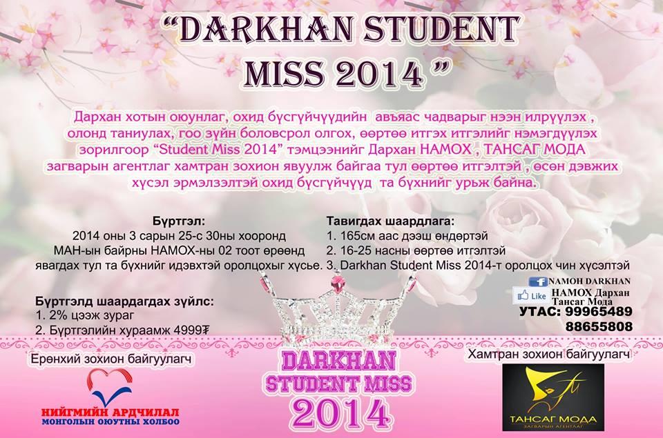 Дархан хотын оюунлаг, охид бүсгүйчүүдийн авъяас чадварыг нээн илрүүлэх, олонд таниулах, гоо зүйн боловсрол олгох, өөртөө итгэх итгэлийг нэмэгдүүлэх зорилгоор "Darkhan Student Miss 2014" нэртэйгээр эргэн ирлээ: