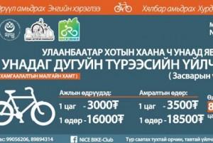 Монголын Залуучуудын Холбоо “Спирт үү, спорт уу” аяныхаа хүрээнд “Унадаг дугуйтай Улаанбаатар” төсөл хэрэгжүүлж эхлээд багагүй хугацаа өнгөрч, энэ хугацаанд олон ч ажил зохион байгуулаад байгаа юм.Үүний нэг нь түрээсийн дугуйн үйлчилгээ. Хувьдаа дугуйгүй ч унадаг дугуйгаар зугаалмаар санагдвал МЗХ-ны хашаанд байрлах “Nice bike” дугуйн түрээсийн үйлчилгээнд хандаж болно. Эндээс түрээсэлсэн дугуйгаа хотын хаашаа ч унаж явах боломжтой. Үнийн хувьд ч боломжийн ажлын өдөр дугуйн түрээс нэг цаг нь 3000 төгрөг бол бүтэн өдөржин ашиглахад 16 мянган төгрөг. Үйлчилгээгээ нээгээд удаагүй учраас унадаг дугуйнууд нь ч шинэ. Мөн тус төвийн дэргэд засварын төв нээгдсэн учраас унадаг дугуйтай хүмүүс үйлчлүүлэх боломжтой юм билээ.