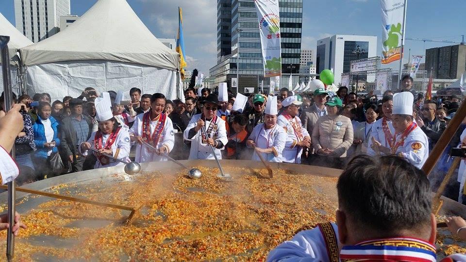 “Намрын ногоон өдрүүд-2015” нэгдсэн арга хэмжээний нээлтийн үеэр Монголын мастер тогоочдын холбооноос зохион байгуулсан “Мастер тогоочдын хоолны өдөрлөг” олны анхаарлыг татаж байсан юм. Энэ талаар Монголын мастер тогоочдын холбооны гүйцэтгэх захирал Р.Батбаатар “Монголын хоол үйлдвэрлэл, үйлчилгээний салбарын Улсын 2 дугаар зөвлөгөөн энэ сарын 28-ний өдөр буюу маргааш зохион байгуулагдах гэж байна. Зөвлөгөөнийг угтаж мастер тогооч нарын хамтарч хийж буй ажлын нэг хэсэг нь энэ боллоо. Тодруулбал, Гүн шим сургалтын хамт олон, Монголын мастер тогоочдын холбооны гишүүд, орон нутгийн мастер тогооч нар хамтран Монголд анх удаа 1000 гаруй хүнийг хамарсан хоолны амталгаа явууллаа. Энэхүү будаатай хуургыг 3.5 диаметрийн харьцаатай хайруулын тавган дээр хийсэн бөгөөд 100 кг будаа, 30 кг мах, 8 кг улаан лооль, 6 кг ногоон сонгино зэрэг олон нэр төрлийн хүнсний бүтээгдэхүүн орсон. Бид хамтын хүчийг бэлэгдэж энэхүү хоолыг хийлээ” хэмээв.