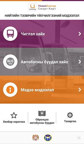 Та google playstore хуудсаар дамжуулан “ulaanbaaatar smart bus”аппилейкшныг татаж авснаар нийслэлийн нийтийн тээврийн үйлчилгээний цагийн хуваарь, автобусны буудал, чиглэлийн зураглалыг харж болно. Мөн өөрийн тань сонирхсон буудлыг дамжин өнгөрөх бүх чиглэлийн мэдээлэл, автобусны хоорондын хүлээгдлийн хугацааг ч харах боломжтой. Хамгийн сонирхолтой нь та суух гэж байгаа чиглэлийнхээ бүх автобуснуудын байршлыг харж болохоороо онцлогтой. Одоогоор Android үйлдлийг системтэй утсанд зориулсан хувилбарыг Play store дээр байрлуулсан бөгөөд тун удахгүй IOS үйлдлийн системд зориулсан хувилбарыг Apple store-д байрлуулах юм гэж Нийслэлийн Тээврийн газраас мэдээллээ.
