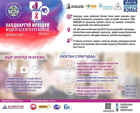 “Халдваргүй Ирээдүй – Мэдлэгээ хэрэглээ болгоё” төслийг 2017 оны 4-р сарын 12 – 2017 оны 12-р сарын 31-ны хооронд МЗХ-оос санаачлан хэрэгжүүлэхээр боллоо. Төслийг “Монголын Гэр Бүлийн Сайн Сайхны Нийгэмлэг”, “Халдварт Өвчин Судлалын Үндэсний Төв”, “Ү PEER” үе тэнгийн боловсролын үндэсний сүлжээ, “Marie Stopes” Олон улсын байгууллага хамтран хэрэгжүүлэх юм. Төслийн ерөнхий ивээн тэтгэгчээр “Бамбууш” ХХК ажиллаж байгаа юм байна.
