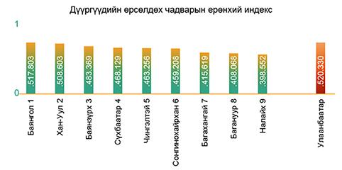 Шалгуур үзүүлэлтүүдийг ашиглан өрсөлдөх чадварын индексийг Улаанбаатар хот болон 9 дүүрэг тус бүрийн хувьд тооцсон. Дүүргүүдийн өрсөлдөх чадварын индекс нь 0-1 хооронд утга авах утгын дарааллаар дүүргүүдийг эрэмбэлсэн. Энд индексийн утга 0 бол өрсөлдөх чадвар сул, 1 бол өрсөлдөх чадвар өндөр гэж ойлгож болно. Тухайлбал: