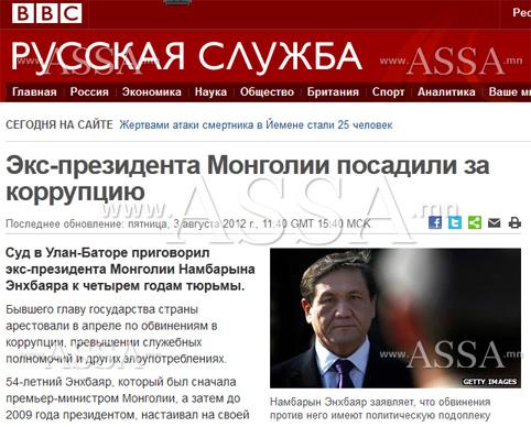 Улаанбаатар хотноо шүүхээс Монгол Улсын экс ерөнхийлөгч Намбарын Энхбаярыг 4 жил шоронд хорих шийдвэр гаргалаа. Н.Энхбаярыг дөрөвдүгээр сард авлига, албан тушаалаа урвуулан ашигласан зэрэг хэрэгт буруутган баривчилсан юм. Ерөнхий сайд, УИХ-ын дарга, Ерөнхийлөгч асан тэрээр өөрийнхөө бурууг хүлээхгүй, харин ч улс төрийн зорилгоор өөрийг нь буруутгаж байна гэж мэдэгдэж байсан юм. Хятадын Синьхуа агентлагийн мэдээлснээр Н.Энхбаярыг шашин сурталчлах зориулалттай телевизийн тоног төхөөрөмжийг хууль бусаар авсан, зочид буудал, хэвлэлийн газрыг хууль зөрчин хувьчилж авсан гэж буруутгажээ. Шүүх эхлээд экс-ерөнхийлөгчийг долоон жил хорьж, хөрөнгийг нь хураахаар шийдвэрлэсэн ч хоригдох хугацааг нь дөрвөн жил болгож богиносгосон юм. Шүүх бас хийдэд мөнгө төлөх ёстой гэжээ.