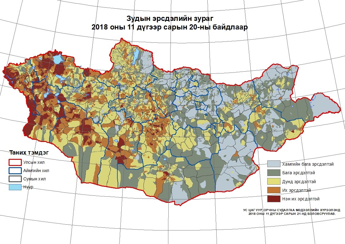 Цаг уур, орчны шинжилгээний газраас 2018 оны 11 дүгээр сарын 20-ны байдлаар гаргасан зудын эрсдэлийн зургаас үзвэл нийт нутгийн 20 гаруй хувьд нь өвөлжилт, хаваржилт хүндрэх болзошгүй эрсдэл гарчээ. Үүнд Баян-Өлгий, Увс, Ховд, Говь-Алтайн ихэнх, Завхан, Баянхонгор, Өвөрхангай, Архангайн зарим нутаг хамрагдаж байгаа юм.