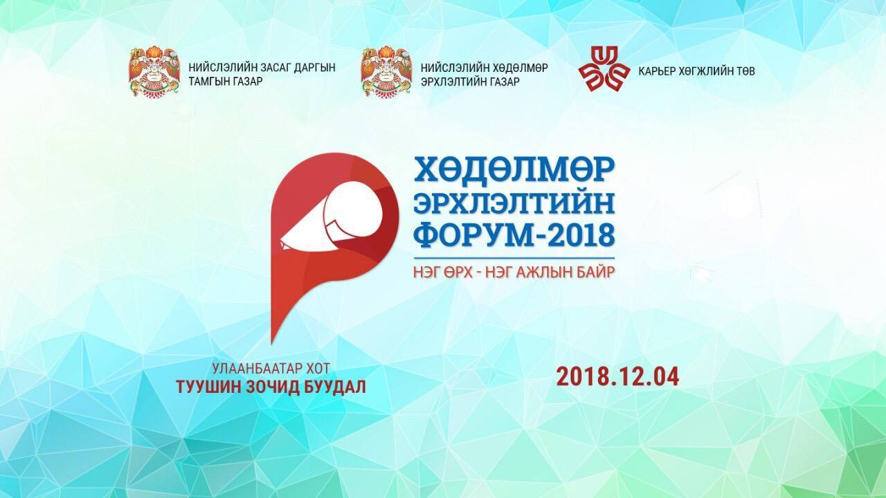 Нийслэлийн Хөдөлмөр ээрхлэлтийн газар санаачлан, Нийслэлийн Засаг даргын Тамгын газар, Карьер хөгжлийн төв хамтран энэхүү форумыг зохион байгуулж байна. Туушин зочид буудлын хурлын танхимд зохион байгуулагдах энэхүү форумаар “Хөдөлмөр эрхлэлтийн салбарын өнөөгийн байдал, ирээдүйн чиг хандлага”, “Ажиллах хүчний хомсдол уу, менежментийн хомсдол уу”, “Хөдөлмөр зуучлалын үйлчилгээний инноваци”, “Ажлын хандлага нь ур чадвараас илүү”, “Мэргэжил сонголт, хөдөлмөрийн бүтээмжийн уялдаа” гэсэн салбар хуралдаан болох юм.