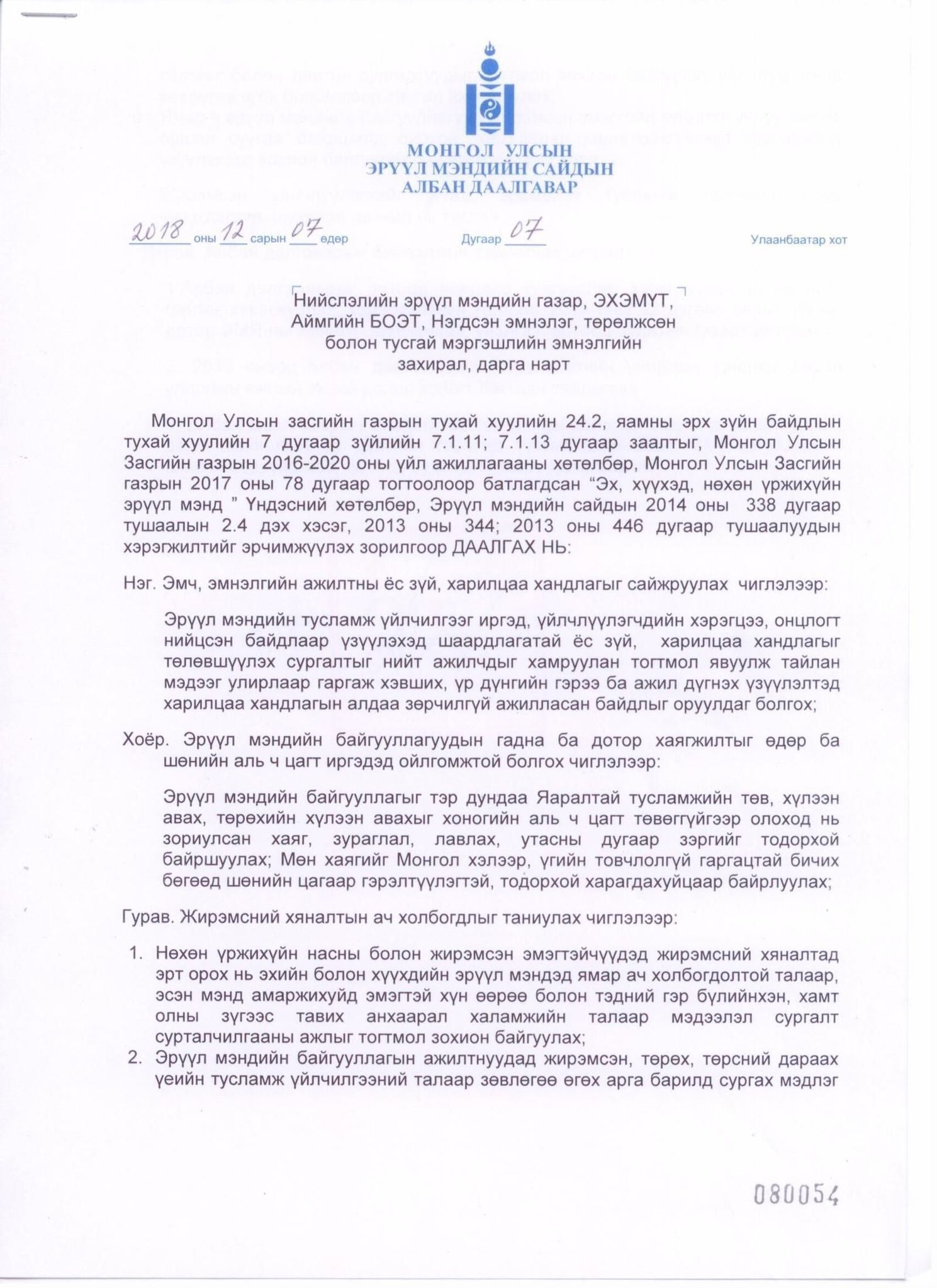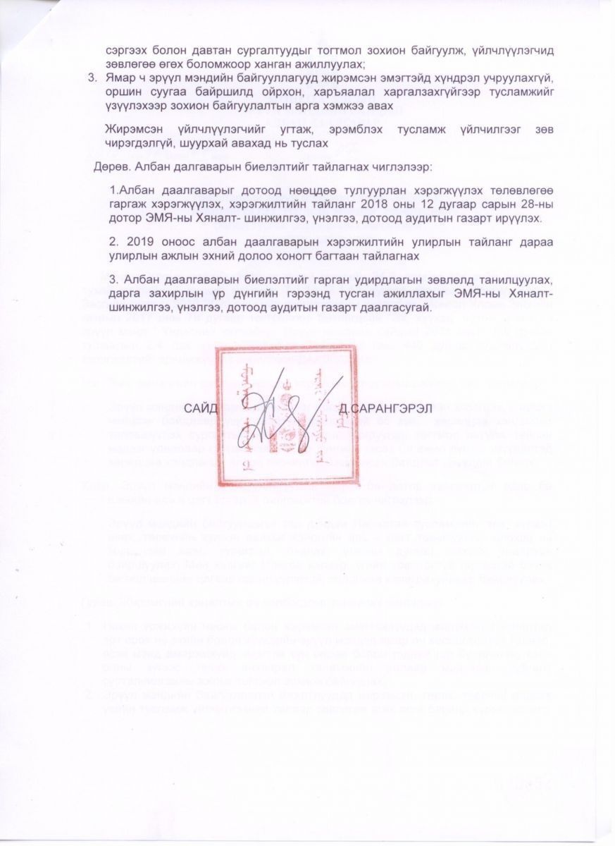 Эрүүл мэндийн сайд Д.Сарангэрэлийн албан даалгавар гарчээ. Үүнд Жирэмсэн эмэгтэйчүүдэд харьяалал харгалзахгүйгээр тусламж үзүүлж байхыг, Эрүүл мэндийн байгууллагуудын хаягийг гэрэлтүүлэгтэй болгож, монгол хэлээр бичихийг даалгасан байна. Албан даалгаврыг бүрэн эхээр нь хүргэе.