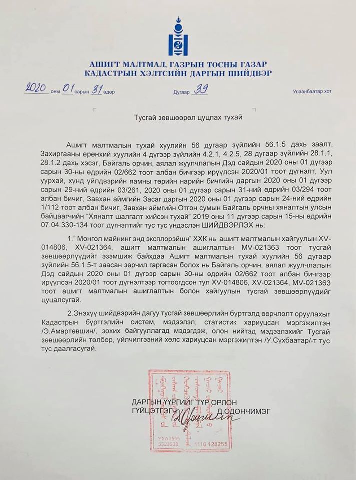 Хайглууын 2 тусгай зөвшөөрөл, ашиглалтын 1 тусгай зөвшөөрөл гээд нийт 3 ширхэг тусгай зөвшөөрлийг Ерөнхий сайдын чиглэлийн дагуу Ашигт малтмалын тухай хуулийн 56.1.5, Захиргааны ерөнхий хуулийн 4.2.1, 4.2.5, 28.1.1, 29.1.2 заалтуудыг үндэслэн цуцалсан байна.