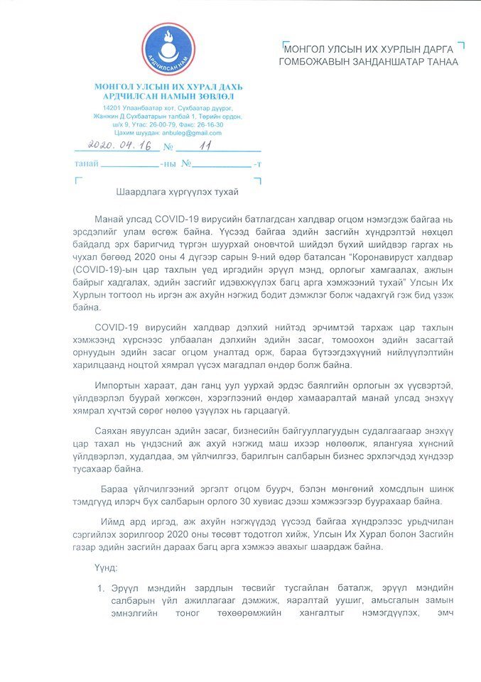 УИХ дахь АН-ын зөвлөлөөс УИХ-ын дарга Г.Занданшатар болон, Ерөнхий сайд У.Хүрэлсүх нарт хүргүүлсэн шаардлагыг бүрэн эхээр нь хүргэж байна. Бичигт “Шаардлага хүлээн аваагүйгээс үүсэх нийгэм эдийн засгийн сөрөг үр дагаврыг эрх баригчид хариуцна гэдгийг үүгээр мэдэгдэж байна” гэжээ.