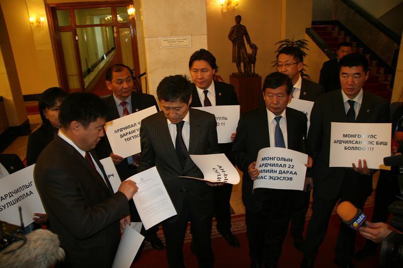 УИХ-ын сонгуулиар Өвөрхангай аймгийн 10 дугаар тойрогт МАН-аас нэр дэвшин өрсөлдөж олонхийн санал авсан ч сурталчилгаандаа насанд хүрээгүй хүүхэд оролцуулсан, архи, эд зүйл тараасан хэргээр шүүхийн шийдвэр гарч, С.Чинзориг, Н.Төмөрхүү нарыг эргүүлэн татаж, АН-аас нэр дэвшигч Г.Батхүү, Д.Зоригт нарыг тангараг өргүүлэх болсноос үүдэн МАН ийм эсэргүүцлийн хөдөлгөөн эхлүүлээд байгаа юм. Өчигдөр МАН-ын гишүүд дэмжигчид Төрийн ордны гадна жагссан бол МАН-аас УИХ-д сууж байгаа гишүүд УИХ-ын чуулганыг хуралдуулахгүй хэмээн чуулганы танхимын гурван хаалгыг хааж, уриа лоозон барьж суусан юм.