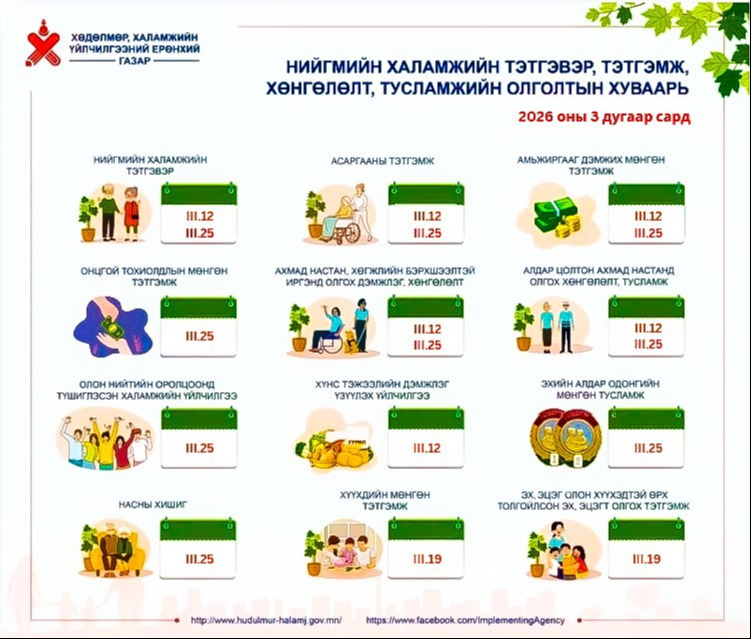 2026 оны гуравдугаар сарын хүүхдийн мөнгө, нийгмийн халамжийн тэтгэвэр, тэтгэмж олгох хуваарийг танилцуулж байна.