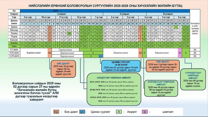 2024-2025 оны хичээлийн жилийн бүтцийг шинэчлэн баталж, бие даалт, цахим сургалт, амралтаас бүрдэх онцлогтой болгосон. Сурагчдын I улирлын амралт арванхоёрдугаар сард, II улирлын амралтыг дөрөвдүгээр сард, III улирлын амралтыг зургаадугаар сард товлосон байна. Үүний дагуу сурагчид гуравдугаар сарын 31-нд хичээллээд, нэг долоо хоног бие даалт буюу цахимаар хичээллээд, үргэлжлүүлэн долоо хоног амарна.