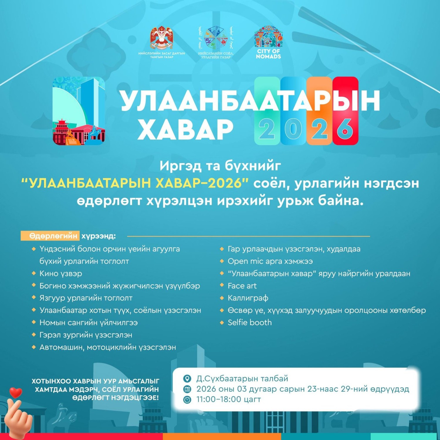 - Сельфи бүүт гэсэн соёл, урлагийн олон талт арга хэмжээ зохион байгуулагдах хөтөлбөртэй байна.