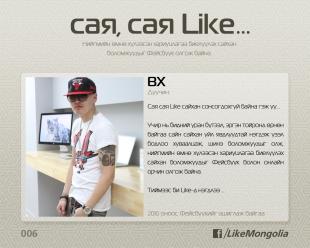 “Like-д нэгдэцгээе” уриатай шинэ үеийн давалгаанд нэгдсэн залуусын тоо өнөөдөр 43210 хүрээд байна. Цахим ертөнцийн гол үнэлэмж болох like-аар залуусын дуу хоолойг илэрхийлж, залуусыг эерэг хандлага, эерэг сэтгэлгээнд уриалах зорилготой энэ аянд нэгдсэн залуус өвөрмөц байдлаар сэтгэгдлээ илэрхийлжээ.