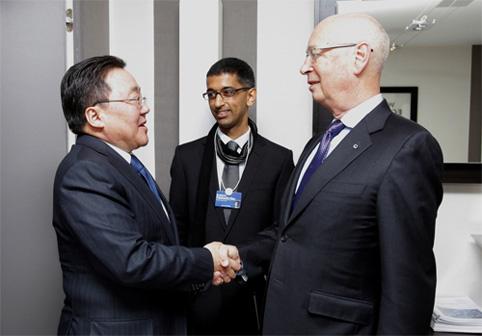 Монгол Улсын Ерөнхийлөгч Цахиагийн Элбэгдорж Дэлхийн эдийн засгийн чуулга уулзалтын дарга, профессор Клаус Швабыг хүлээн авч уулзав. Уулзалтын эхэнд профессор Шваб “Давосын чуулга уулзалтад хүрэлцэн ирсэн ноён Ерөнхийлөгч танд баярлалаа. Монгол орон өөдрөг боломж дүүрсэн, манлайлал, санаачилга, оролцоогоороо тод ялгарсан орон болж байна” гэв.