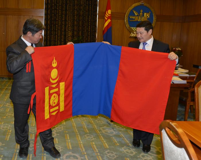 Дэлхийн бөмбөрцгийн өмнөд туйлын 0 цэг рүү аялал хийх Монголын Антарктидын нийгэмлэгийн тэргүүн, профессор Л.Дүгэржавд Ерөнхий сайд Н.Алтанхуяг Монгол Улсын төрийн далбааг гардуулан өгч, аялалд нь амжилт хүслээ.