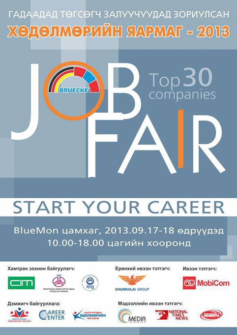 “Монгол-Германы гүүр” (МГГ) ТББ-аас 2013 оны 9 сарын 17-18-ны өдрүүдэд Job Fair “Хөдөлмөрийн Яармаг-2013”-ыг зохион байгуулах гэж байгаа билээ. Энэ жил “Start Your Career!” уриан дор 6 дахь жилдээ зохион байгуулагдаж буй уг арга хэмжээг ХБНГУ-ын Олон улсын шилжилт хөдөлгөөн хөгжлийн төв (ОУШХХТ), Монголын залуучуудын холбоо, Монголын ажил олгогч эздийн нэгдсэн холбоо