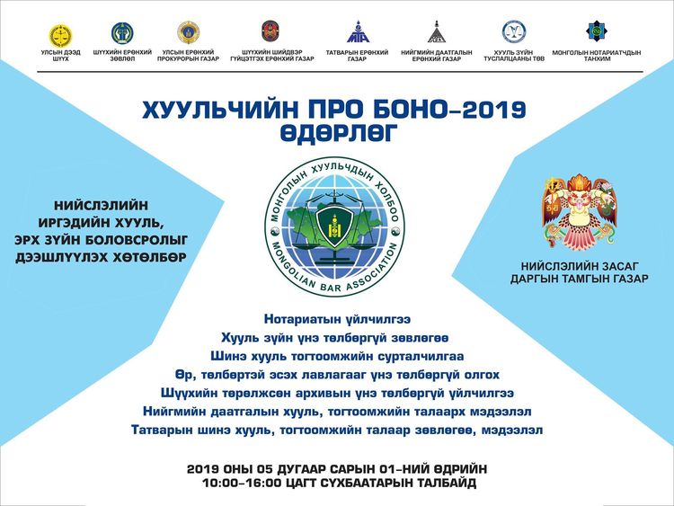 Монголын Хуульчдын холбоо нь гишүүн хуульчдынхаа сайн дурын оролцоо, идэвх санаачилгад тулгуурлан нийтийн тусын тулд болоод нийгмийн эмзэг хэсгийн эрх, хууль ёсны ашиг сонирхлыг үнэ төлбөргүйгээр төлөөлөн хамгаалах, хууль зүйн туслалцаа, өмгөөллийн үйлчилгээг үнэ төлбөргүй үзүүлэх, иргэдийн эрх зүйн боловсролыг дэмжих, хууль тогтоомжийг боловсронгуй болгохтой холбоотой үйл ажиллагааг тогтмол хэрэгжүүлдэг бөгөөд Монголын Хуульчдын холбооны Ерөнхийлөгчийн тушаалаар жил бүрийн тавдугаар сарын 01-ний өдрийг “Хуульчийн про боно өдөр” болгон зарлаж, Монгол орон даяар тэмдэглэн өнгөрүүлэхээр шийдвэрлэсэн билээ.