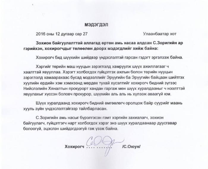 Төр нийгмийн зүтгэлтэн С.Зоригийн амь насыг бүрэлгэсэн хэргийн шүүх хурал өнөөдөр дууслаа. Таван өдрийн турш хуралдсан хуралдаанаар Ц.Амгаланбаатар, Б.Содномдаржаа, Т.Чимэгээ нарыг С.Зориг агсны амь насыг хөнөөсөн хэмээн үзэж 24-25 жилийн хорих ял оноосон юм. Ингээд шүүх хурлын шийдвэрийг