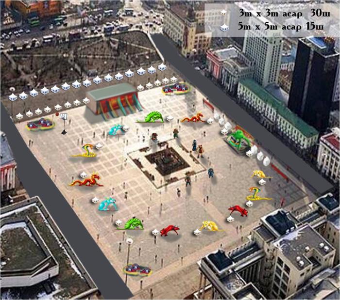 Тодруулбал, Чингисийн талбайн баруун талд буюу Нийслэлийн Засаг даргын тамгын газрын урд хэсэгт тайзыг байрлахаар зураг гарсан бөгөөд тайз нь хүүхдийн баярыг илтгэхүйц онцлогтой, талбайг тойруулан 12 жилийн амьтдыг байрлуулахаар болжээ.