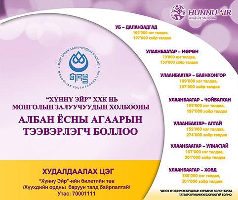 Монголын Залуучуудын Холбоо, “Хүннү Эйр” агаарын тээвэрлэгч компанитай хамтран орон нутгийн чиглэлд залуусыг хөнгөлөлттэй үнээр зорчих боломжийг олголоо. МЗХ төрийн болон төрийн бус, хувийн гээд бүхий л байгууллагатай харилцаа хамтын ажиллагаагаа